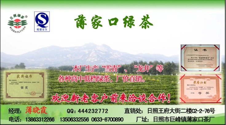 本厂生产雪青、龙井等各种高中低档绿茶,厂价直销,欢迎新老客户前来洽谈!