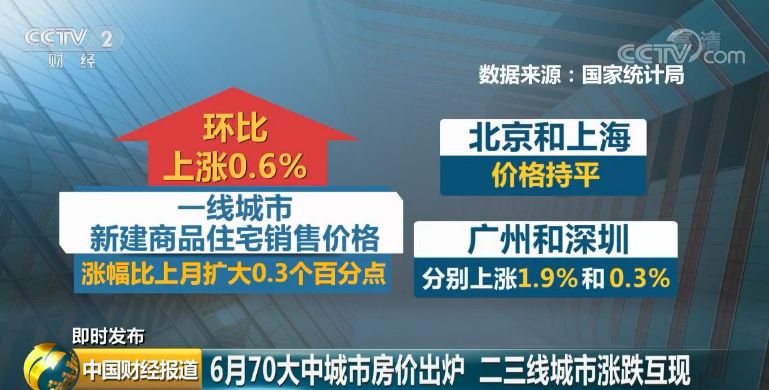 从环比看,一线城市新建商品住宅销售价格上涨0.6%,涨幅比5月扩大0.3个百分点,其中北京和上海价格持平,广州和深圳价格分别上涨1.9%和0.3%;