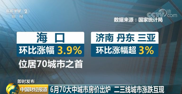 在70个大中城市中,价格下降的城市有4个,上涨的城市有63个。其中,海口环比涨幅最高达3.9%,而丹东新建商品房同比涨幅最高达到15%,继五月后再次领跑70城。