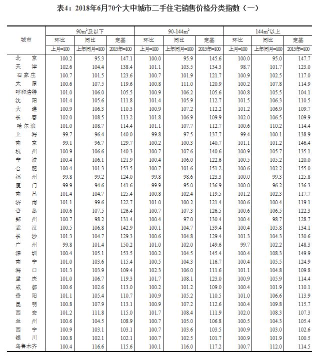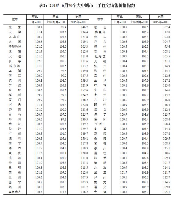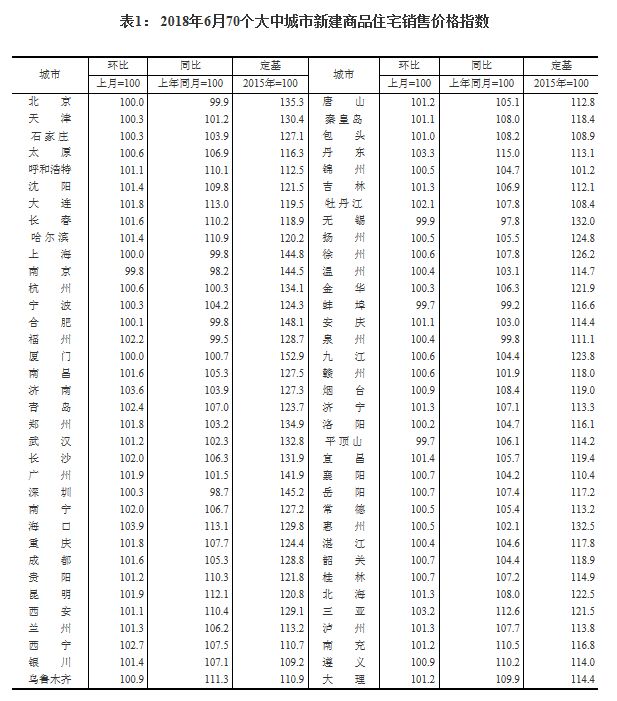 从短期的调控到长效机制之间,我们更多地要做好市场预期的引导。前期住建部等几个部委出台的政策,其实就是对整个市场预期做一个强势的引导,也就是说我们仍然坚持不放松,不动摇的房地产的调控价值取向。2018年6月份70个大中城市商品住宅销售价格变动情况
