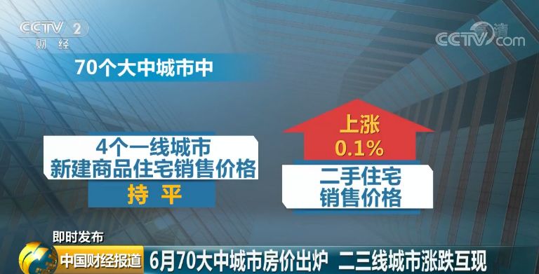 4个一线城市新建商品住宅销售价格持平,二手住宅销售价格由5月下降转为上涨0.1%。