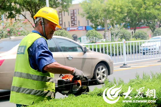 上午10点,园林工人在海曲路分车带处修建绿篱