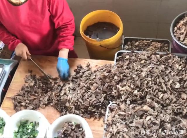 看这桌子上全是切好的羊肉,感觉都快堆成一座小山丘了,让人看着就想流口水,而且老板还在不断的切肉,毕竟这么多肉一到饭点就会被清空,所以老板要提前切好。除了羊肉之外,还有羊肚、羊肺、羊肝、羊血等内脏,跟羊肉搭配在一起,放到碗里,用热汤一烫,加上香菜和羊汤就可以上桌了,而且热情的老板还会时不时的给顾客加肉哦,怪不得大家都愿意来这里喝羊汤了。