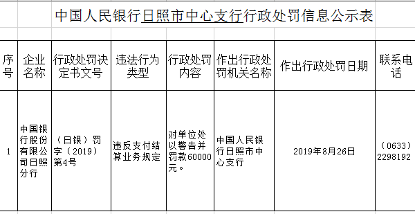 中国人民银行网站昨日公布的行政处罚信息公示表((日银)罚字〔2019〕第4号)显示,中国银行股份有限公司日照分行违反支付结算业务规定。被中国人民银行日照市中心支行处以警告并罚款6万元。