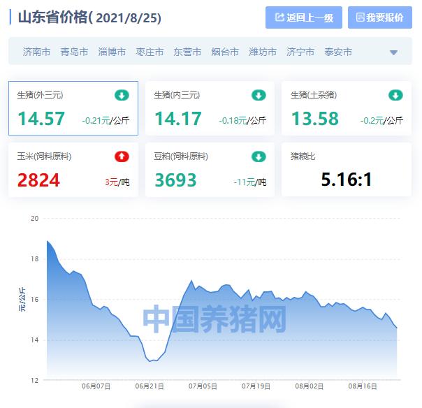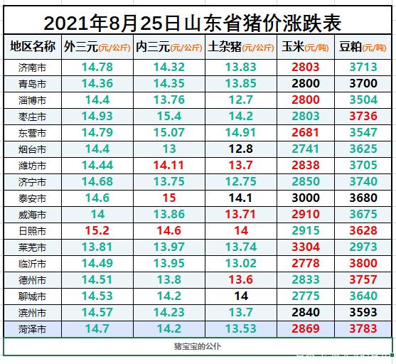 导读:今天是2021年8月25日,山东省猪价整体继续下跌,全省除了日照市因为前天下跌过于严重今日上涨以外,其他地市均下跌。今日济南市的生猪外三元价格为14.78元/公斤,土杂猪价格只有13.83元/公斤;