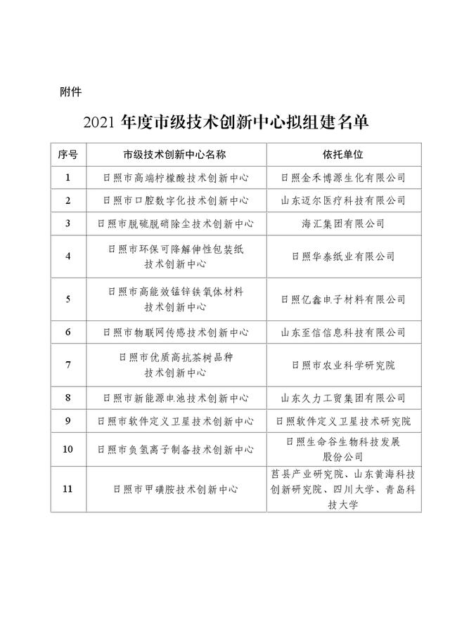 根据《日照市技术创新中心管理暂行办法》(日科字〔2018〕12号)要求,市科技局以“揭榜挂帅”形式筹建市级技术创新中心。经发布筹建需求、意向单位揭榜、区县推荐、线上路演、现场考察等环节,现将2021年度市级技术创新中心拟组建名单予以公示(详见附件)。