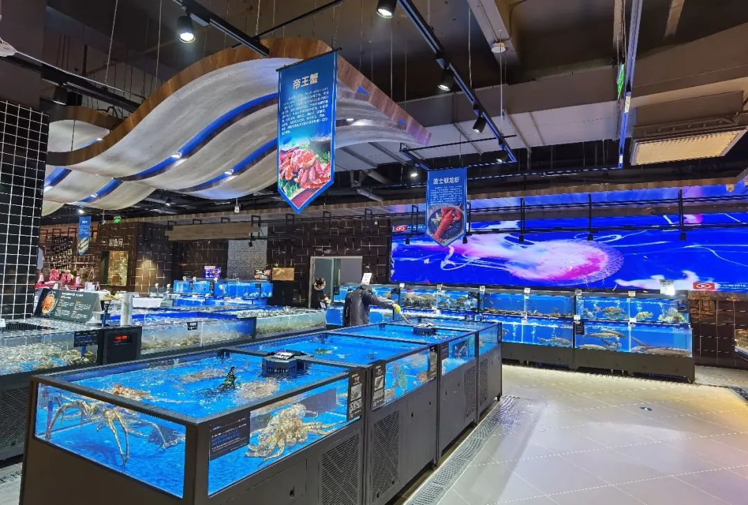 使用国内先进水产养殖设备,采用蛋白分离技术,自然灭菌消毒,保障水产品质量。LED大屏幕巨大的蓝鲸摆动尾巴游动,场景化的体验模式,使人仿佛置身水族馆。倍受喜爱的帝王蟹、面包蟹、澳龙、波士顿龙虾等生猛海鲜一应俱全。活鱼、虾蟹、贝类、冰鲜等水产品达100余个品种,品种达到区域商超齐全。