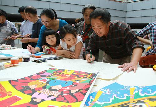 9月22日,小朋友在山东省日照市博物馆观看农民画家作画。 当日,中国日照农民书画艺术节在山东省日照市博物馆开幕,全国各地农民书画家的700多幅作品在此集中展出。据了解,此次艺术节还将举办中国农民国画展、中国农民油画展、书画及衍生产品创作表演等活动。新华社发(李青 摄)