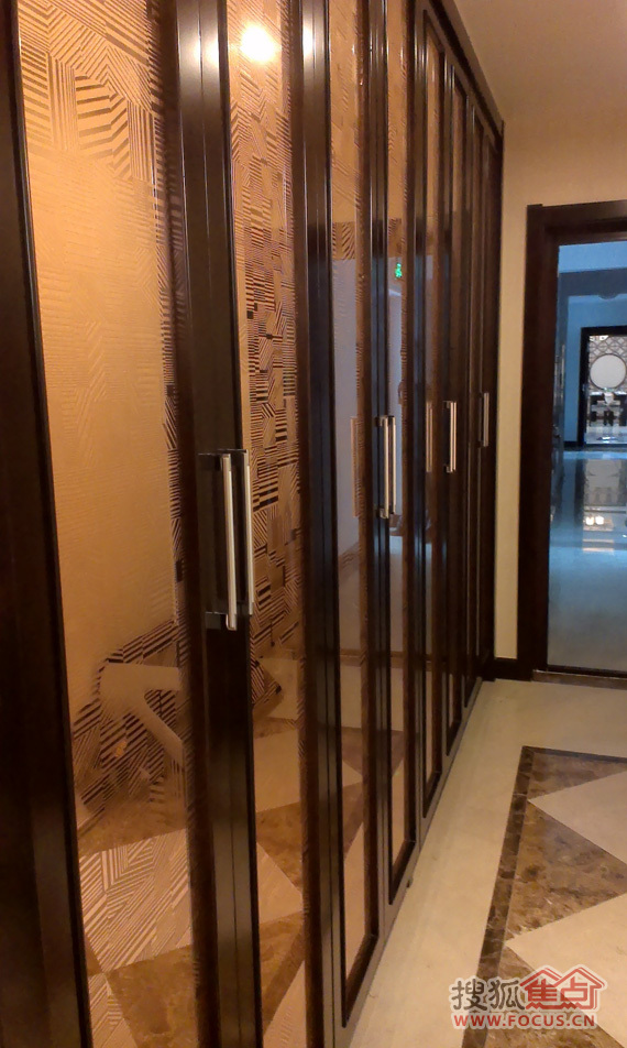 玄关处衣帽柜,开启门扇设计,灰色玻璃与木质相结合,典雅实用