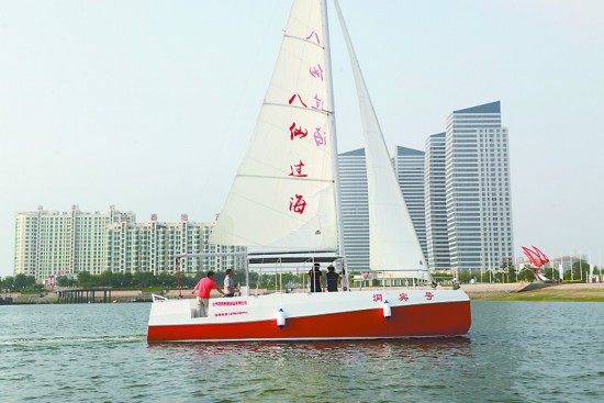 7月8日,在世帆赛基地,“洞宾”号大帆船成功完成试航,将销往蓬莱八仙过海景区。