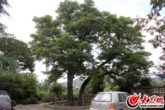 在院子的西南侧,生长着两棵主干相距不到一米的梭罗树,成为了整个院子最大的亮点。东侧那棵树高15米左右,枝叶茂盛,笔直挺立,主干高4米,胸围1.84米,胸径近60厘米,一次分枝处有四大分枝,呈伞状生长,树根处中空,已用水泥抹面填充;西一棵,树干弯曲,西北方向倾斜,像被东侧的树“挤”到了一边,树高15米左右,主干高3米左右,胸围1.35米,胸径43厘米,分两大枝。两棵树的枝叶在空中交错在一起。(记者 崔维成 实习生 徐美) |