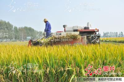 2014年10月7日,山东省日照市莒县阎庄镇超级稻高产攻关基地,收割机正在收割“湘两优2号”超级稻。