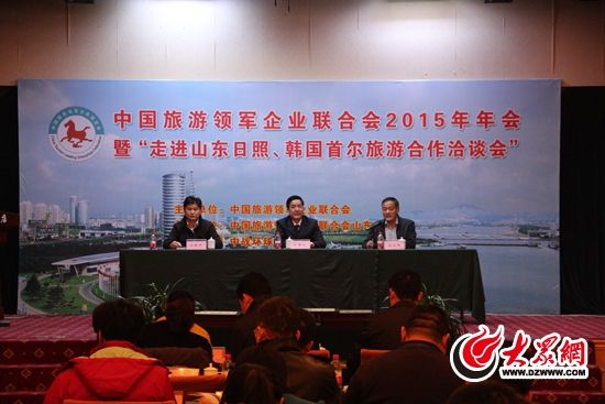 12月2日,在日照天成大酒店,中国旅游领军企业联合会2015年会暨“走进山东日照、韩国旅游合作洽谈会”召开。国内旅游行业领军企业济济一堂,近百名旅行社负责人共同探讨旅游业的未来。在日照期间,与会人员将考察日照灯塔风景区、万平口生态广场(4A级景区)日照海滨国家森林公园(4A级景区)。