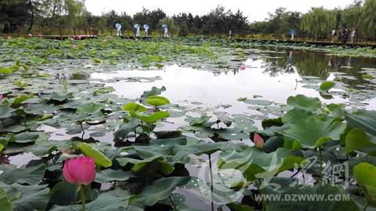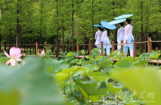 300亩郁郁葱葱的荷花有的已经开放有的含苞待放,粉的、红的,各种颜色交错。荷叶上的雨滴晶莹剔透,偶尔有些鸟儿停落,雾气氤氲,有种如梦如幻的感觉。来自大众网日照拍客团以及慕名而来的摄影爱好者们齐聚一堂,拿起手中的长枪短炮寻找自己心中最美的景象。模特在其中来回穿梭,让景色也增彩许多。