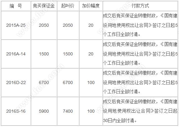2016S-16,位于青岛路以东、山海路以南,面积32765.5平米,用途为商业用地,容积率≤1.2,绿地率≥25%,建筑密度≤20%,出让年限40年,起叫价7400万,加价幅度100万。