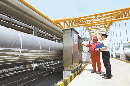 8月4日,在岚山港区实华原油码头,海关关员正在对原油管道监管。