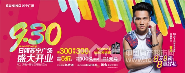 9月30日,日照苏宁广场将是全城最瞩目的地标,活动丰富,精彩纷呈。特邀明星大咖助阵开业现场。10月1日“金曲歌王”曹格将和粉丝们近距离互动,当然还有动听的音乐。9月30——10月7日,精彩继续,热情不减,一系列精彩的活动将持续升温。