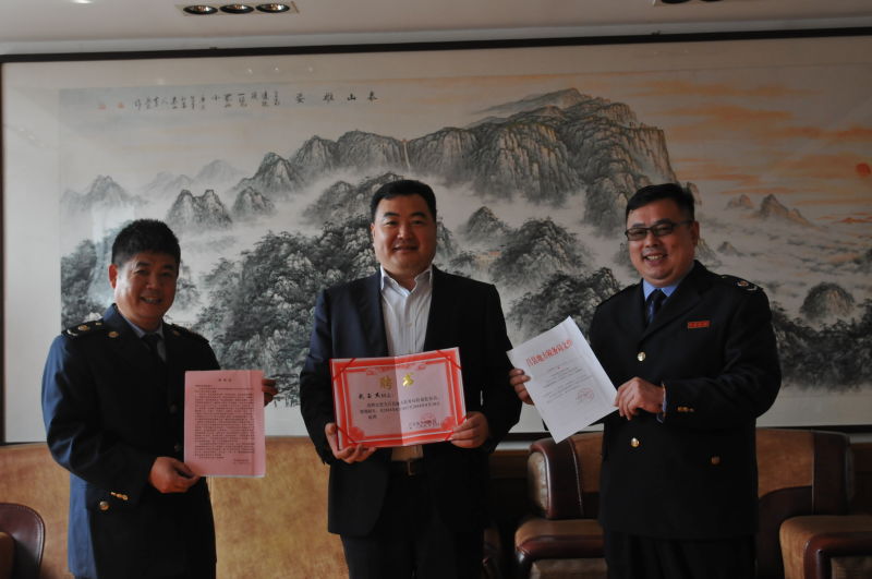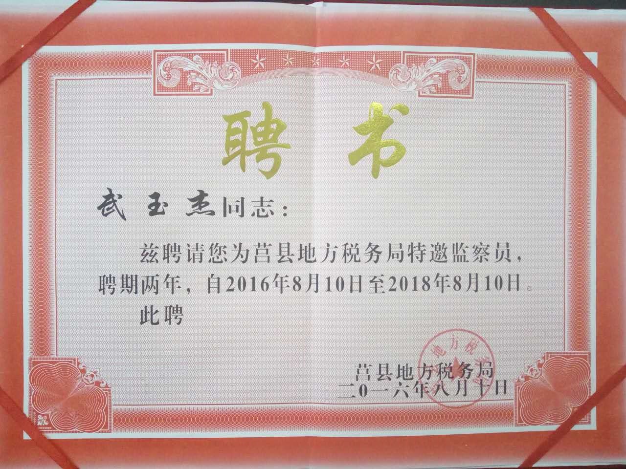 10月17日,集团董事长武玉杰被聘为莒县地方税务局特邀监察员。莒县地税局直属征收局李亭葆副局长、综合管理科唐修和科长亲临国美酒业集团山东有限公司、浮来春集团为董事长武玉杰颁发了聘书。