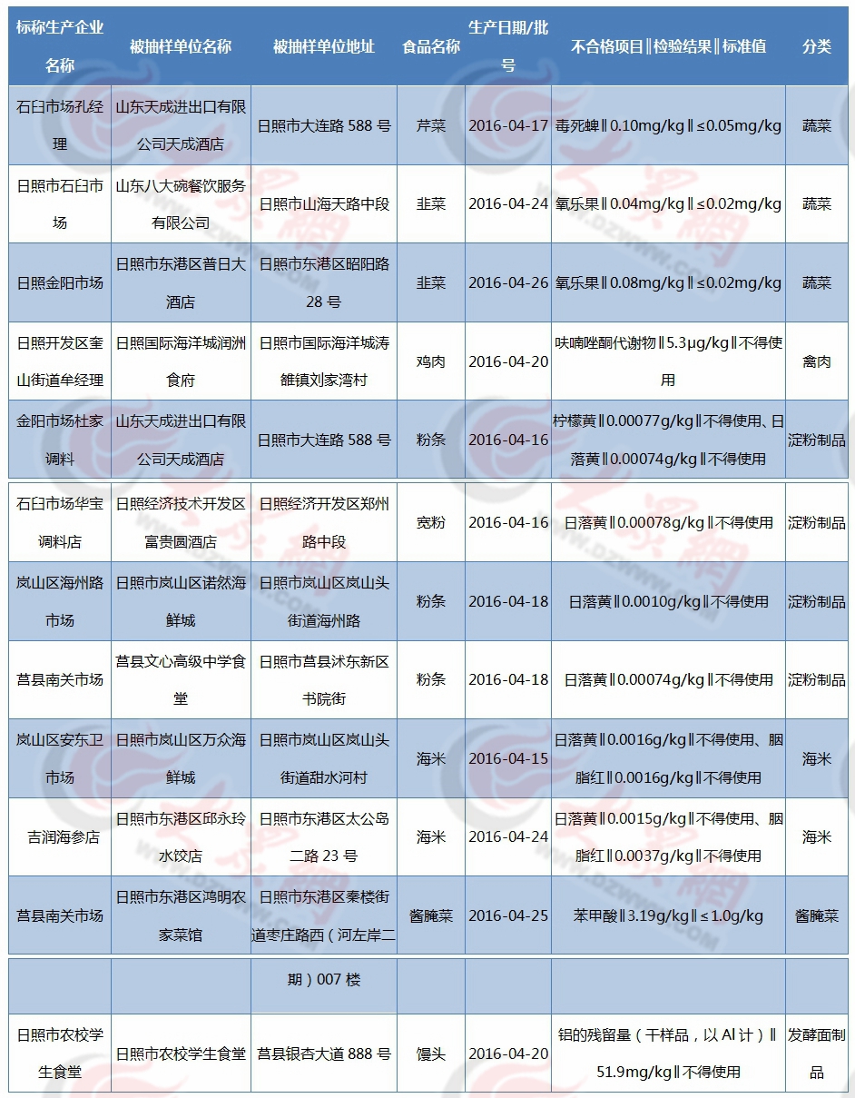 近日,山东省食品药品监督管理局公布2016年第二季度(4月-6月)餐饮服务环节监督抽检结果,日照共有11家餐饮单位上黑榜,其中天成进出口有限公司天成酒店涉及2项。