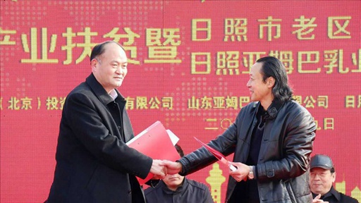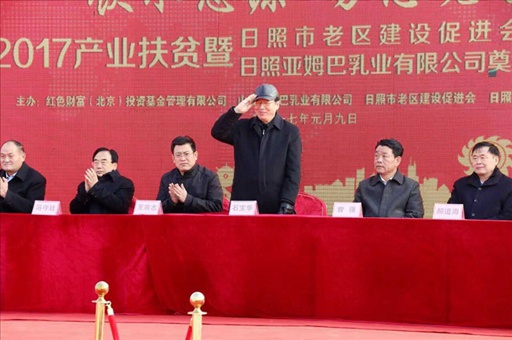 2017年,由日照市老促会、日照亚姆巴乳业有限公司主办的2017产业扶贫暨日照市老区建设促进会揭牌、日照亚姆巴乳业有限公司签约奠基仪式在美丽的山东省日照市黄墩镇崔家沟日照亚姆巴乳业基地拉开序幕,出席仪式的主要领导有: