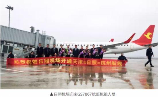 28日中午12点50分,天空下着蒙蒙小雨,随着GS7868航班的顺利抵达,由天津飞往日照再飞往杭州的飞机安全降落在日照山字河机场,航线的开通,将日照到杭州的单程时间缩短为1小时10分钟,为两地往返的乘客提供了极大便利。