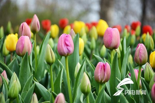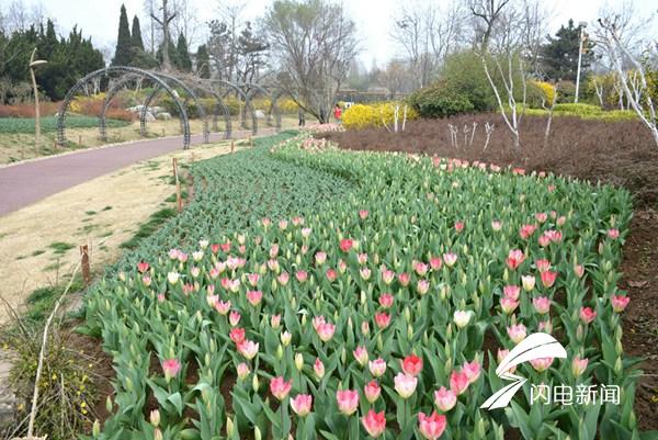 据了解,今年植物园在东西两入口、中轴线廊架周边等六个区域周边精心栽种了香奈儿、杏色印记、白色王朝、新潮、皇家紫等16个郁金香品种,一共约26万株,全部为中花期品种,突出红色系、黄色系,采用大色块、飘带式组合方案形成较强冲击力的视觉效果。目前,郁金香已陆续开放。