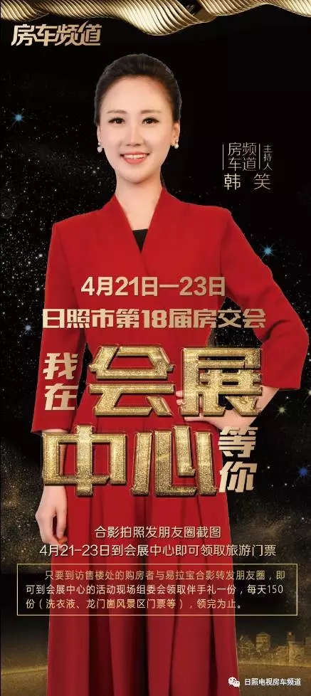 房车频道专门制作了房交会主持人代言的易拉宝,只要到访售楼处(兴业·梦想成真花园、玉兰花园、安泰·名筑(动态 图库 户型)、海洋·新城里(动态 图库 户型)、巴黎名城(动态 图库 户型)、蓝天·尚东区(动态 图库 户型)、浮来春公馆、裕升·华庭(动态 图库 户型)、锦华广场(动态 图库 户型)、赛福特·欧园(动态 图库 户型)、东辰健康智慧城(动态 图库 户型)、发达·紫钰花园(动态 图库 户型)、永利国际(动态 图库 户型)、日照港一区、城投·桂花园、金杉·西城华府、万邦城(动态 图库 户型)、长信·书香河畔(动态 图库 户型)、怡海宜家)的购房者与易拉宝合影转fa朋友quan,即可到会展中心的活动现场组委会领取伴手礼一份,每天150份(龙门崮景区门票一张和固洁洗衣皂一块),领完为止。