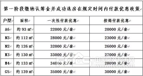 第一阶段认筹:自4月22日(08:58)起至4月28日(18:00)为止,客户缴纳2万元认筹金,即可根据客户购买的户型和面积不同享受以下不同优惠:
