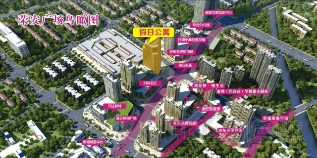 荣安广场·假日公寓、五星街酒店之上的多金公寓、百万方城市综合体中心、各类主题性街区、产业配套、公共配套和生活配套。从衣、食、住、行到办公及经商,提供一站式配套服务。