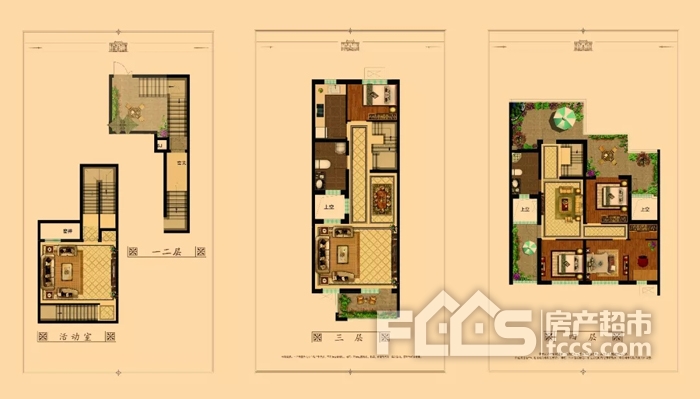 建面约120平:三室、二厅、二卫、一活动室、一院、一露台