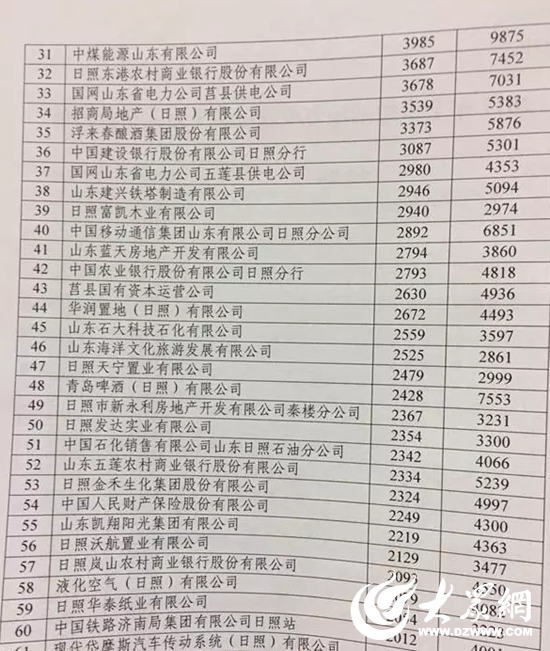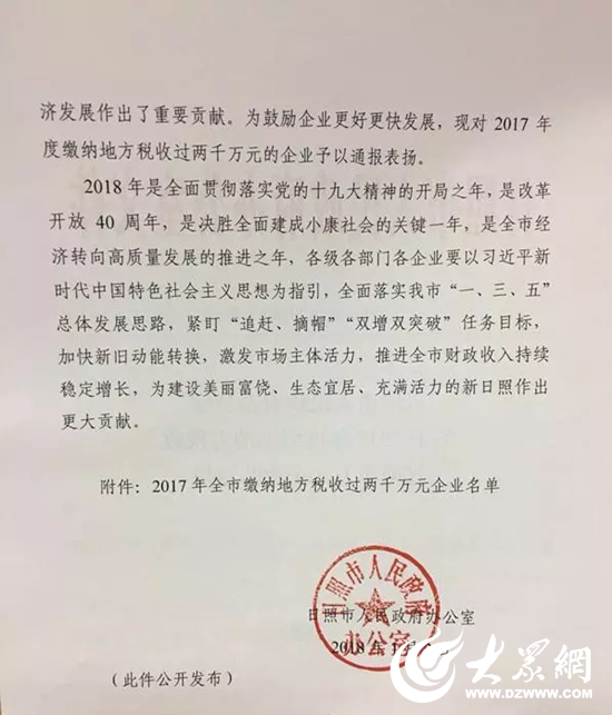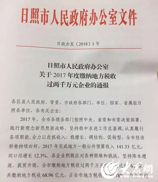日照市人民政府通报表扬61家2017年度纳税大户