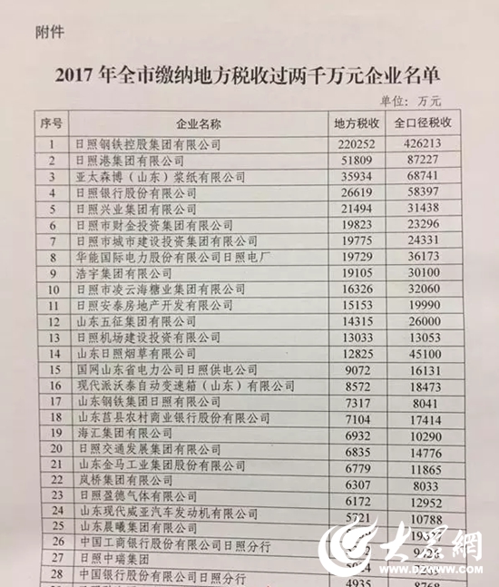 据悉,2017年日照市完成地方一般公共预算收入141.33亿元,同口径增长12.3%。全市各企业积极应对各种困难和挑战,坚持降本增效,提质升级,受到表扬的这61家企业共缴纳地方税收68.96亿元,占全市地方税收的59.78%,为全市经济发展作出了重要贡献。其中日照钢铁控股集团有限公司、日照港集团有限公司、亚太森博(山东)浆纸有限公司位列前三甲。